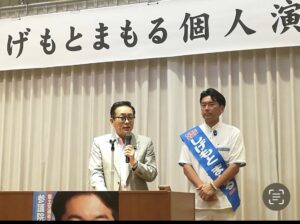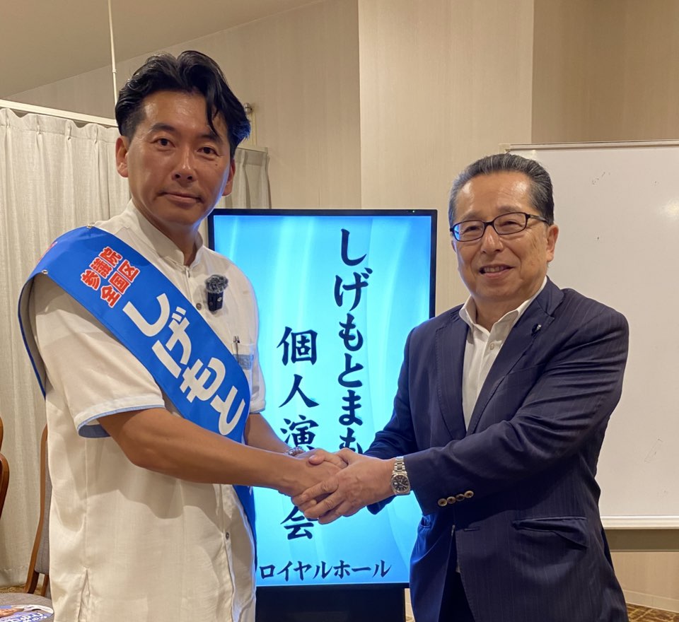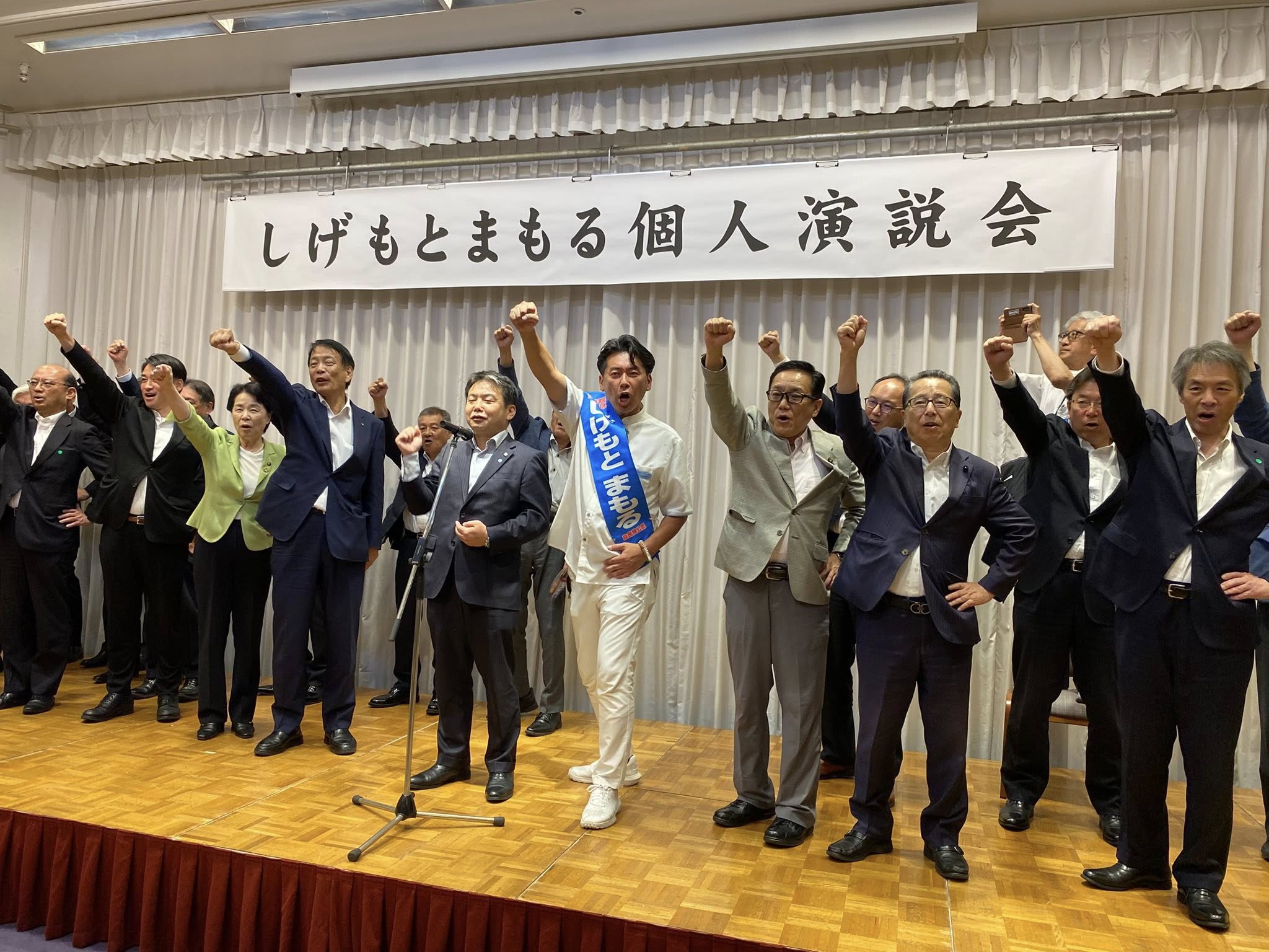 参議院選挙全国比例区しげもとまもる候補の個人演説会が山口市のかめ福オンプレイスで開催されました。(7/17)