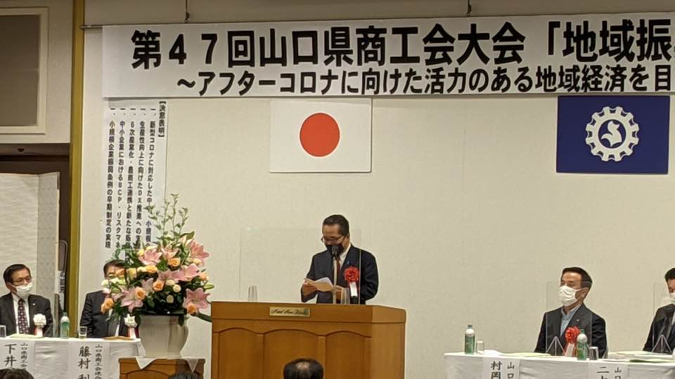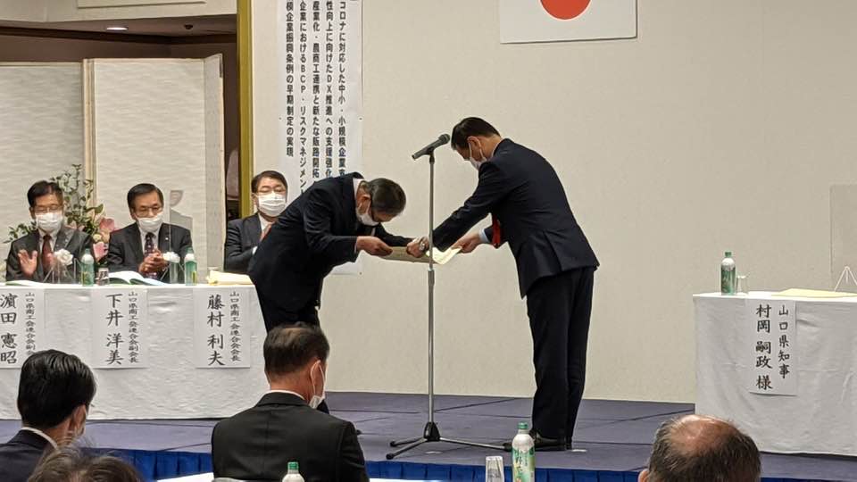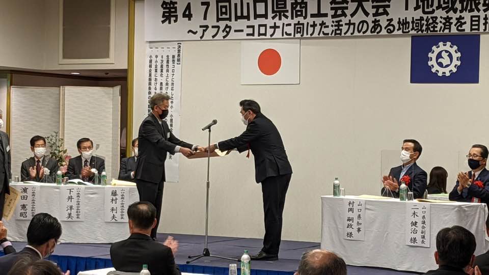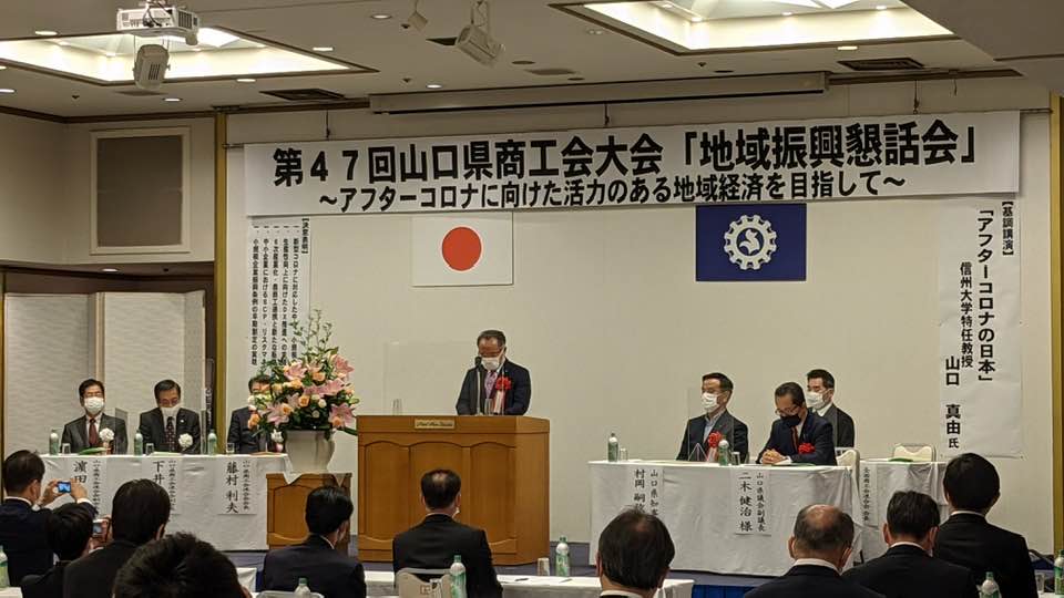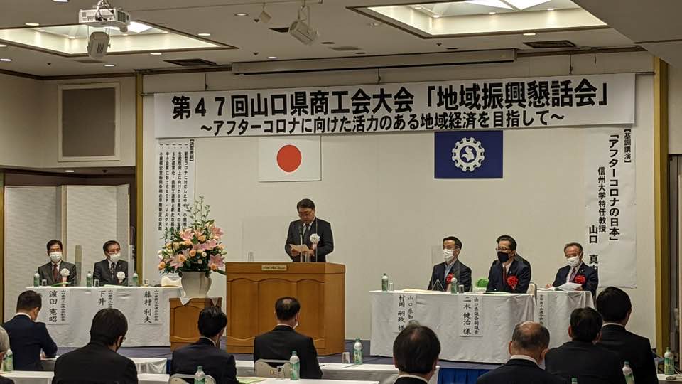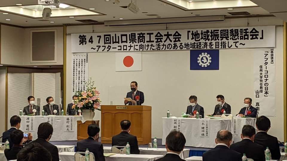 第47回山口県商工会大会「地域振興懇話会」が山口市のホテルニュータナカで開催されました。席上、商工会法施行60周年記念表彰を受賞された皆様の長年のご功績に深甚なる敬意と感謝を申し上げます。