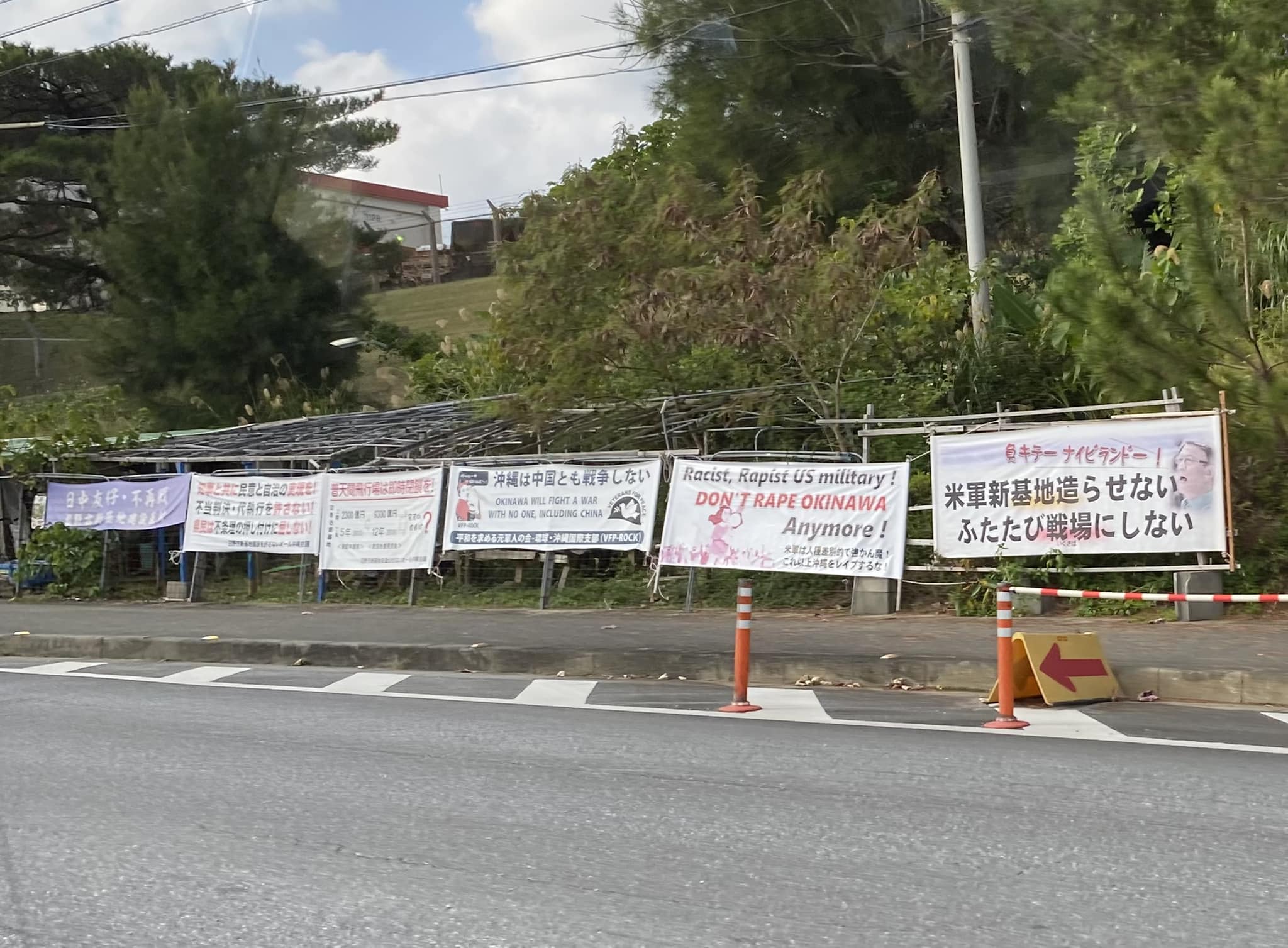 視察2日目です。本日は沖縄防衛局と在日米軍海兵隊基地キャンプシュワブ建設現場を視察しました。キャンプシュワブ建設現場の反対派の無人のテント前には基地建設反対の看板が乱立していました。市街地にある普天間基地周辺の安全確保の為一日も早い建設が急がれますが、反対派の抗議活動で工事が遅れている事が残念です。又、「沖縄は中国とは戦争しない」とか「日中友好・不再戦」など中国寄りの看板が多くあり違和感を感じました。