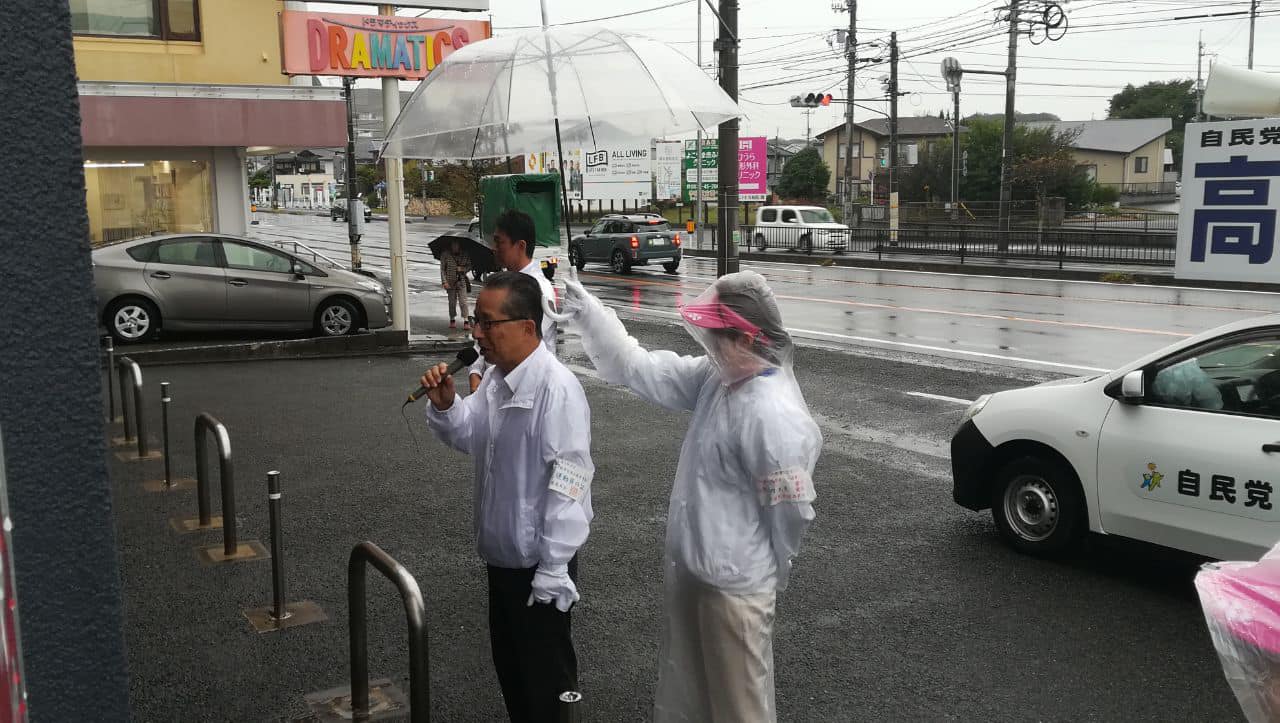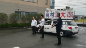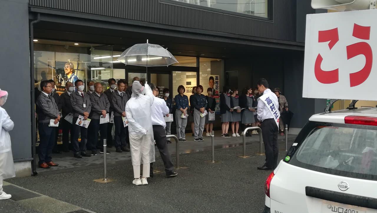 高村正大候補の遊説8日目です。生憎の雨ですが、高村正大遊説隊は元気一杯に宇部市内を駆け巡っています。ご声援をお願い申し上げます。